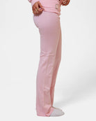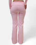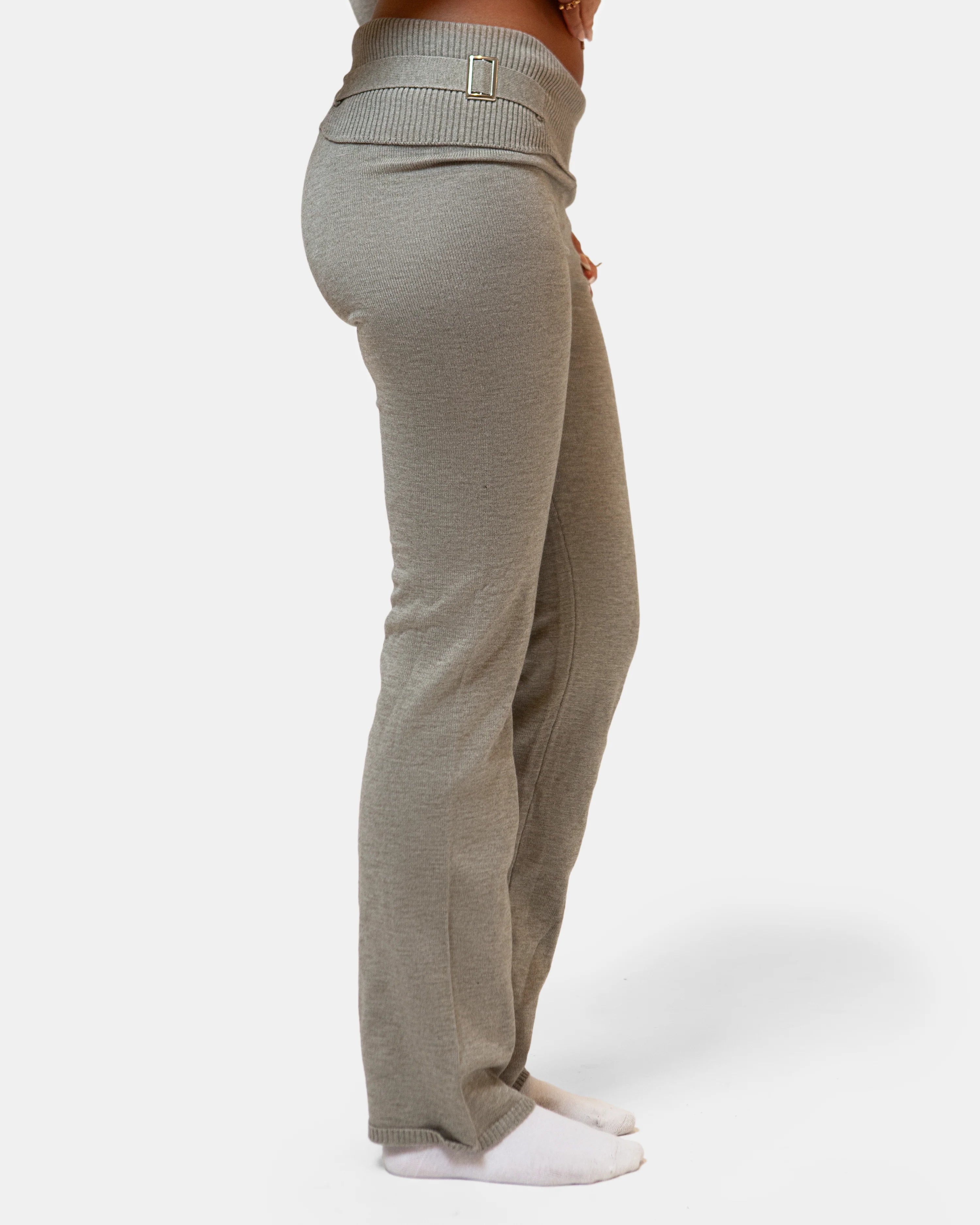 The low-rise pants are cute from every angle, with a ribbed waist, a buckle accent, knit fabric, and flared legs.