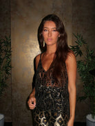 "Top with beads and sequins, in black with a floral print. It has a V-neckline and fabric straps. It is semi-transparent.